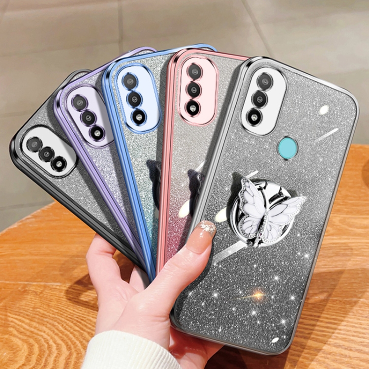 Funda TPU para Motorola Moto E20 con Soporte de Mariposa y Brillo Degradado (Plata)