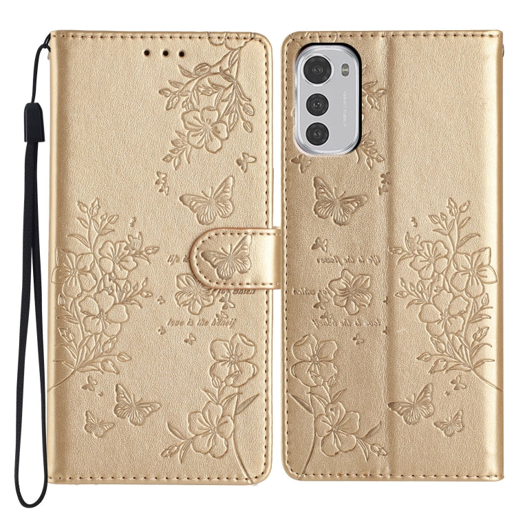 Funda de Cuero para Motorola Moto E32 con Mariposas y Flores (Dorado)