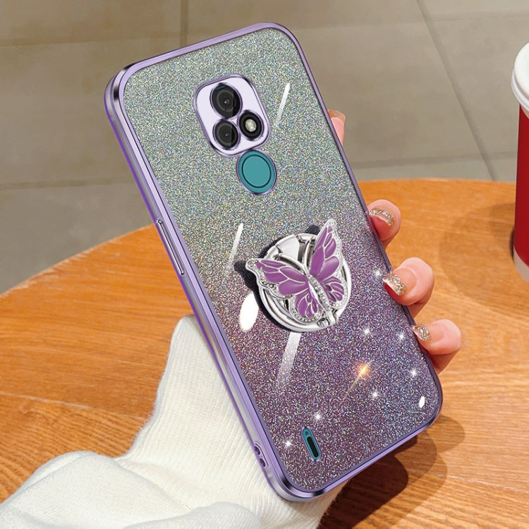Funda TPU para Motorola Moto E7 con Soporte de Mariposa y Brillo Degradado (Púrpura)