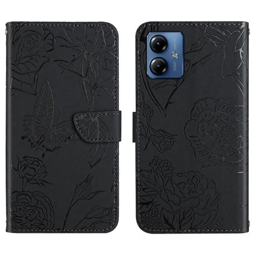 • 1x Funda de Cuero con Tapa en Relieve para Motorola Moto G54 HT03 Skin Feel Butterfly (Negro)