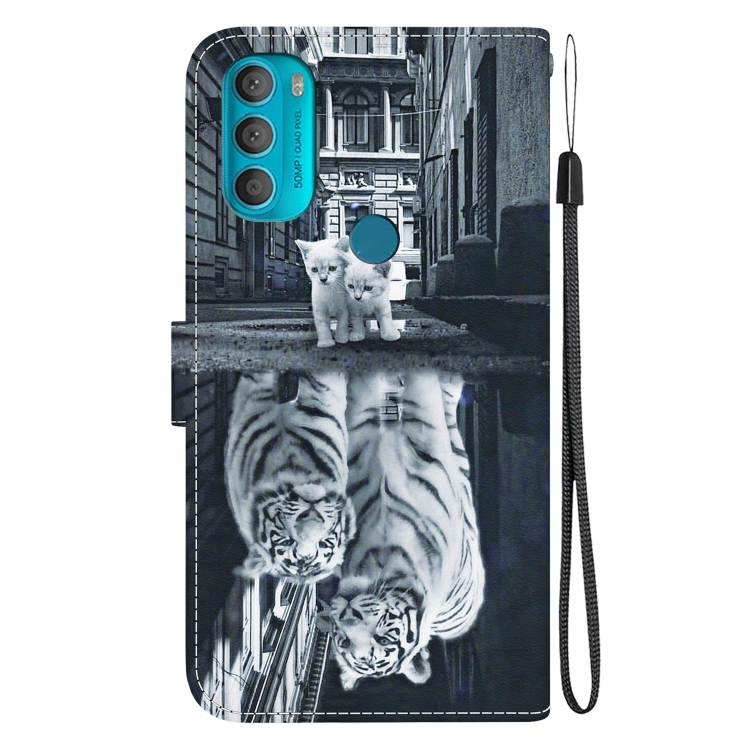 Funda de Cuero para Motorola Moto G71 con Dibujo Coloreado y Textura de Cristal (Reflejo de Tigre Gato)