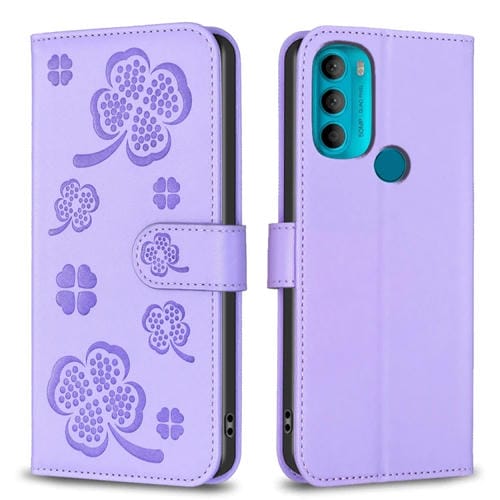 Funda de Cuero para Motorola Moto G71 con Relieve de Cuatro Hojas (Púrpura)