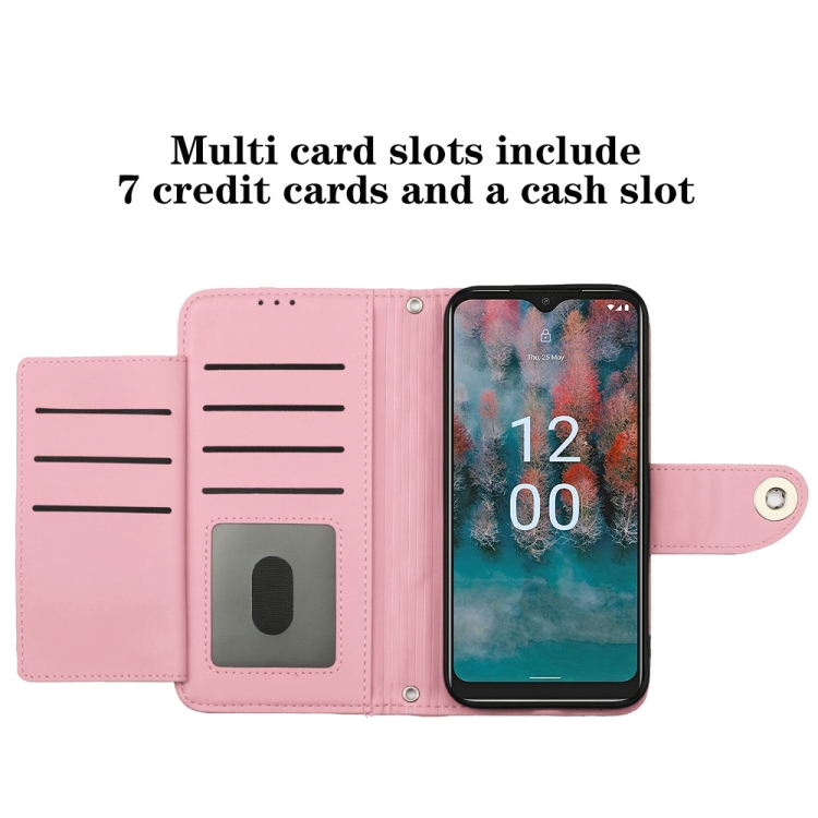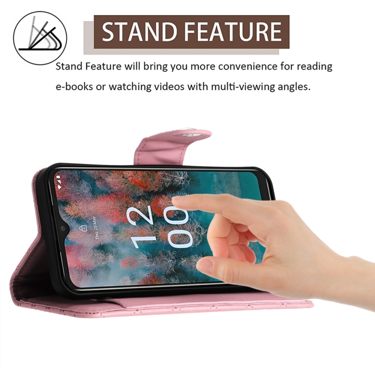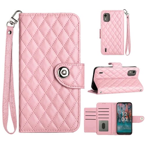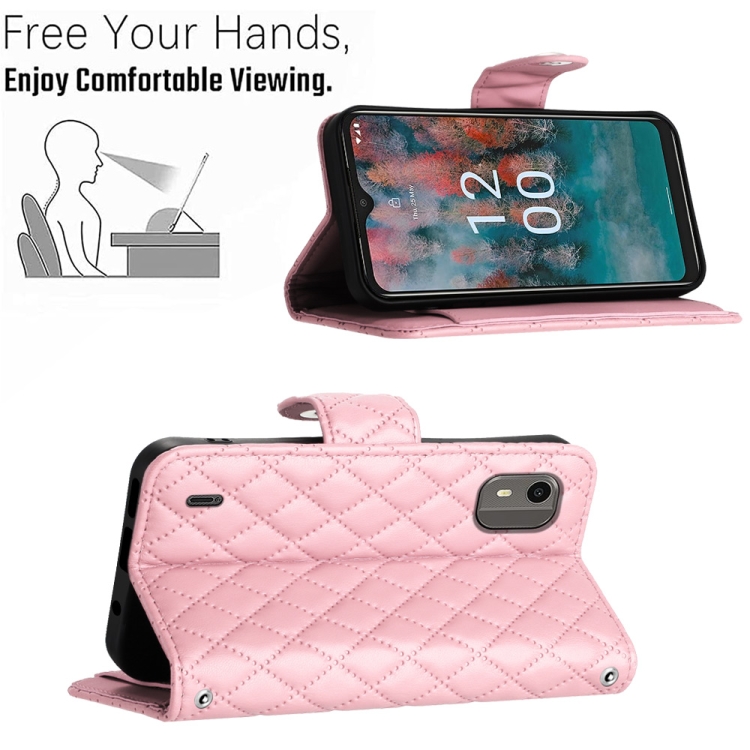 Funda de Cuero para Nokia C12 con Tapa Textura Rómbica y Cordón (Rosa)