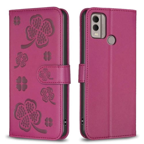 Funda para Nokia C22 de Cuero con Relieve de Cuatro Hojas (Rojo Rosa)