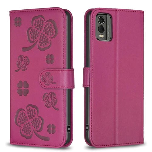 Funda para Nokia C32 de Cuero con Relieve de Cuatro Hojas (Rojo Rosa)