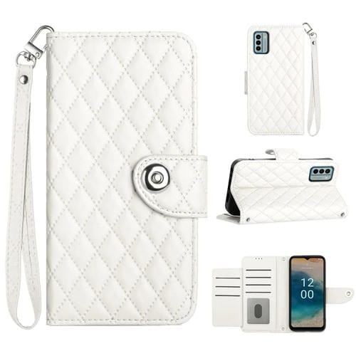 Funda de Cuero para Nokia G22 con Tapa Textura Rómbica y Cordón (Blanco)