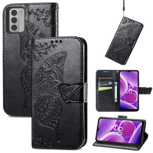 Funda de Cuero para Nokia G42 Butterfly Love Flower con Relieve (Negro)