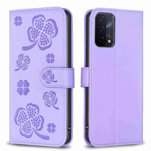 Para Oppo A74 5G / A93 5G / A54 5G Funda para Teléfono de Cuero En Relieve de Cuatro Hojas (Púrpura)