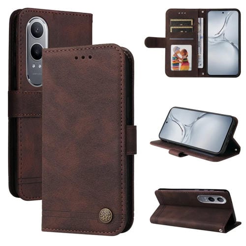 Para Oppo K12X Skin Feel Life Tree Funda de Cuero con Botón de Metal para Teléfono (Marrón)