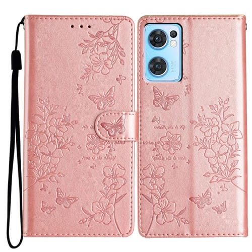 Para Oppo Reno7 5G Funda para Teléfono de Cuero con Relieve de Flor de Amor y Mariposa (Oro Rosa)