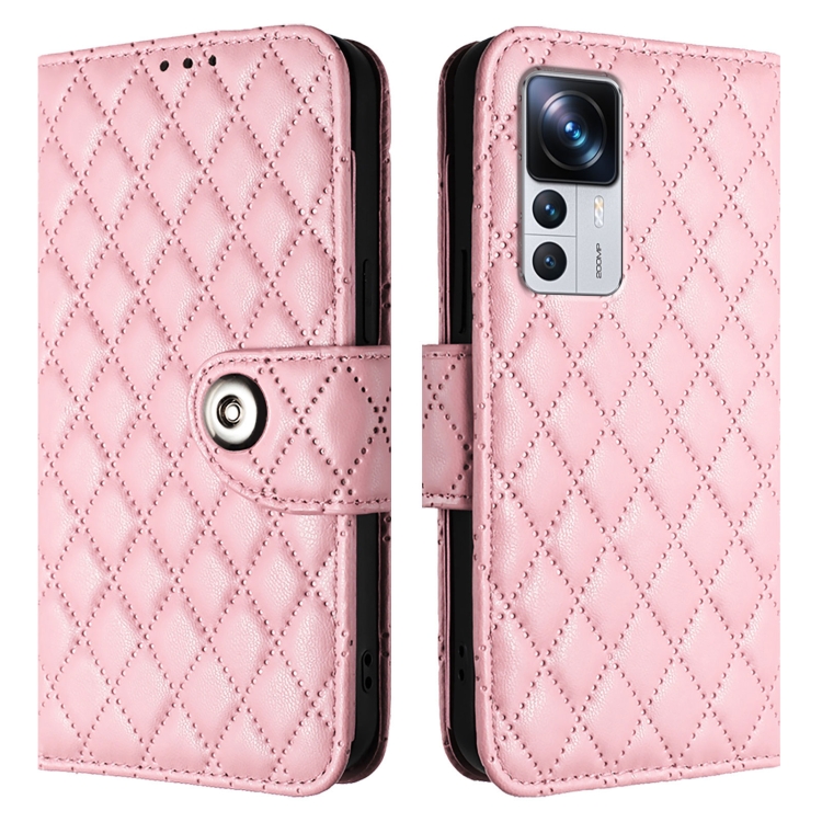 Para Redmi K50 Funda de Teléfono de Cuero con Tapa con Textura Ultra Romboidal y Cordón (Rosa)