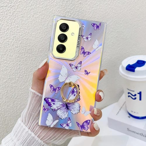 Estuche para Teléfono Samsung Galaxy A15 5G con Soporte Anillo Mariposa Láser Galvanoplastia (Morado Blanco)