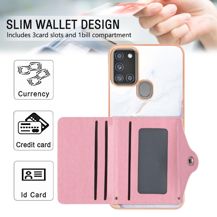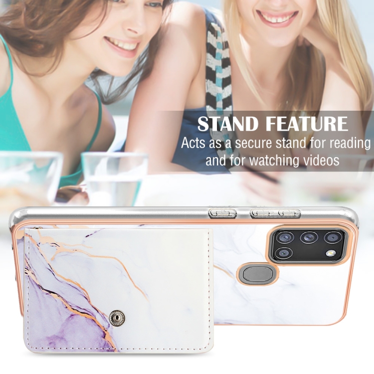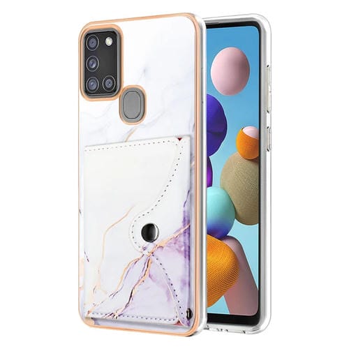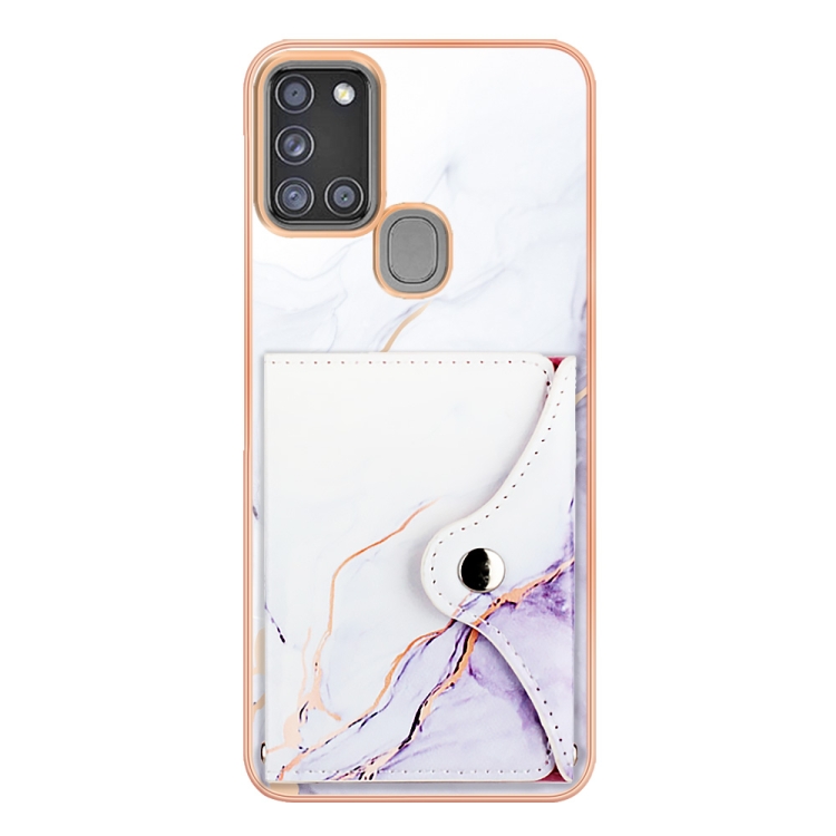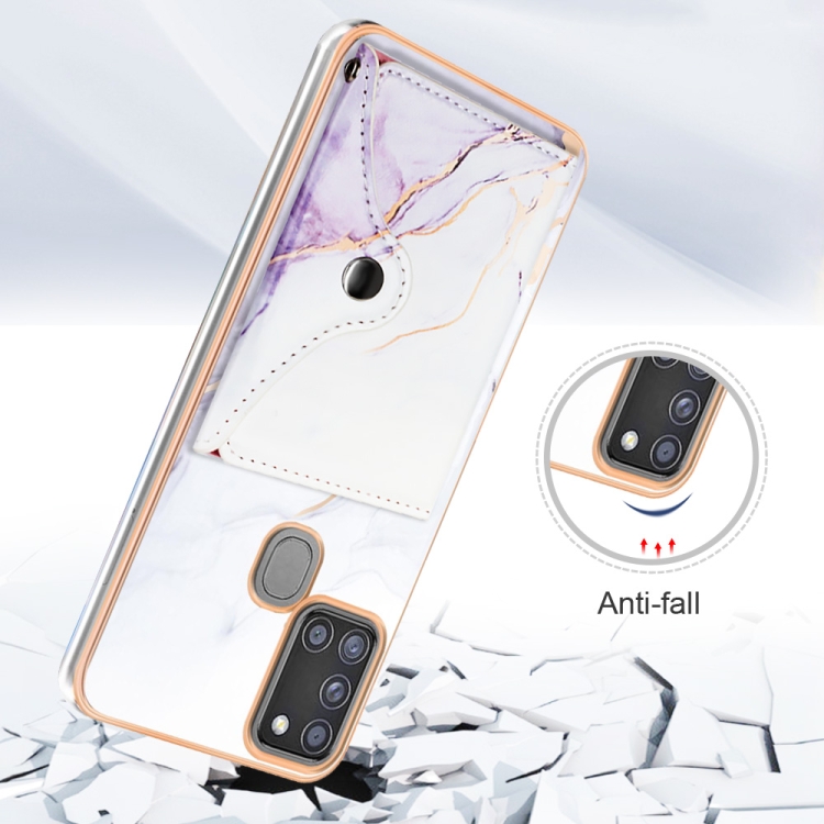 Estuche para Teléfono Samsung Galaxy A21S con Ranura para Tarjeta Imd Patrón Mármol (Blanco y Morado)
