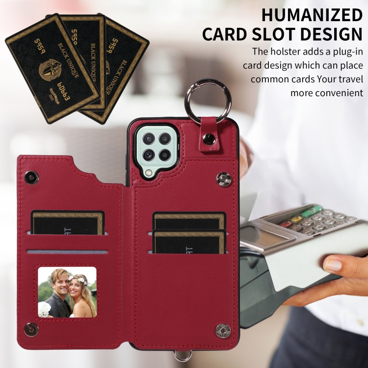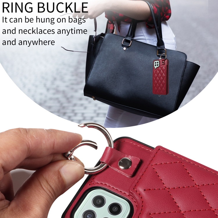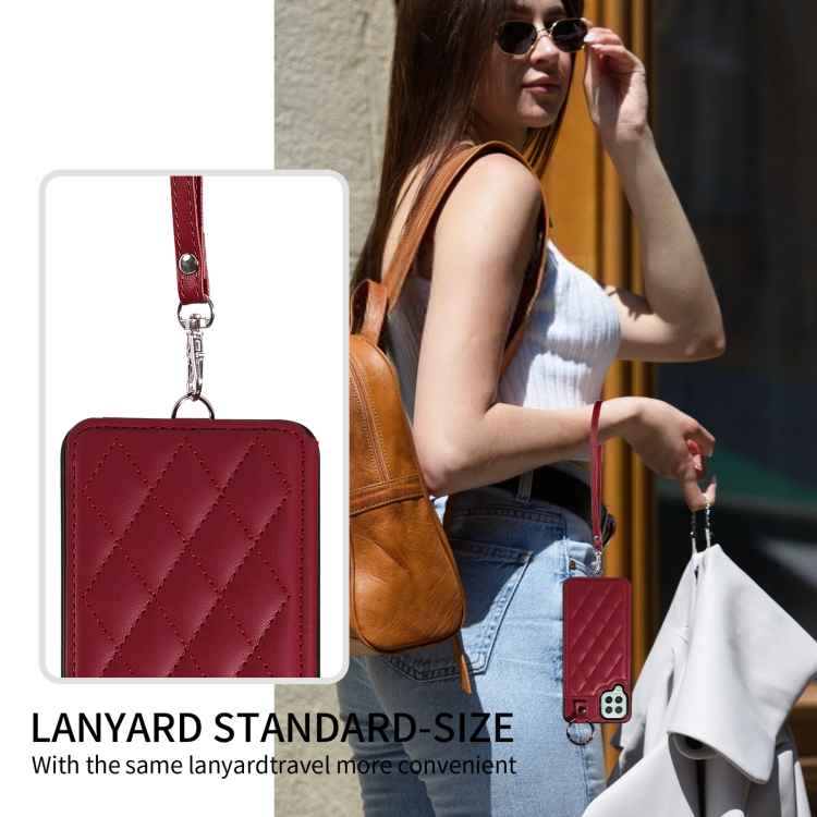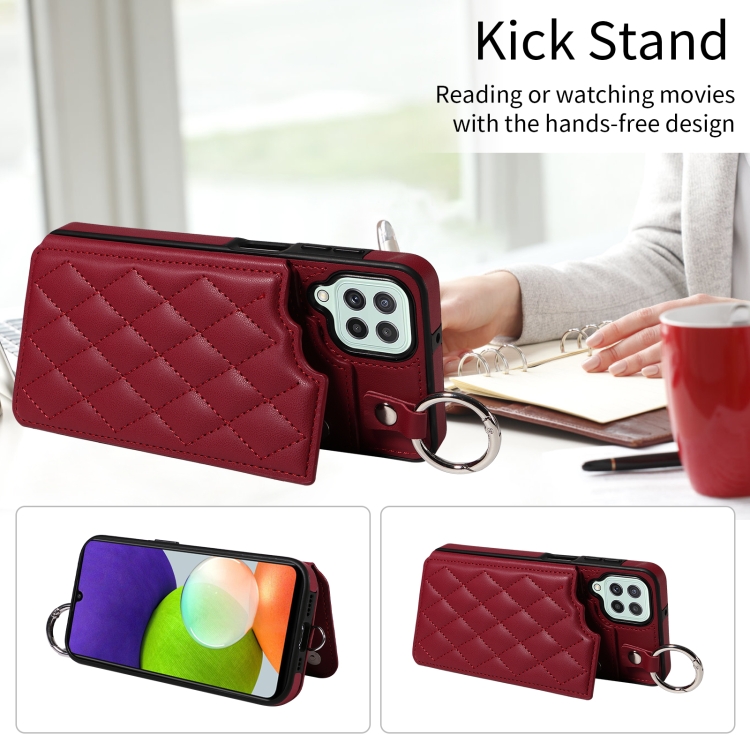 Estuche para Teléfono Samsung Galaxy A22 4G con Bolsa para Tarjetas Textura Rómbica y Cordón Corto (Rojo Vino)