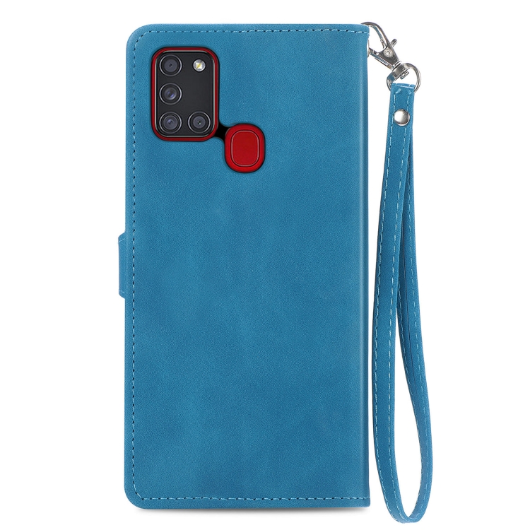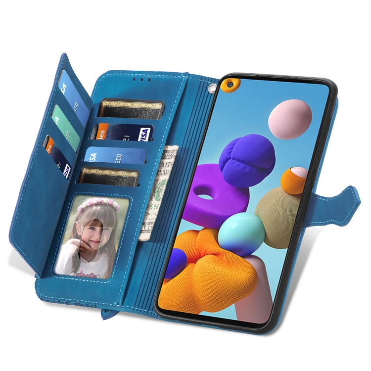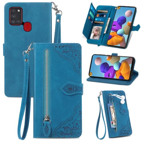 Funda de Cuero para Samsung Galaxy A24S con Cremallera y Flores en Relieve (Azul)