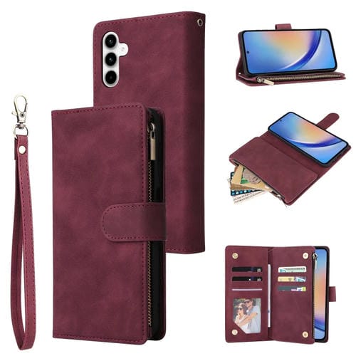 Funda para Samsung Galaxy A35 5G Cuero con Billetera y Cremallera Multifuncional (Rojo Vino)