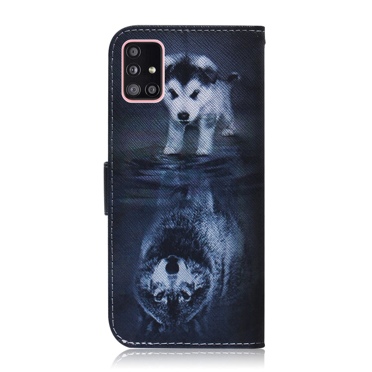 Estuche de Cuero Abatible Horizontal Samsung Galaxy A51 5G con Dibujo Coloreado Soporte Ranura Tarjeta Billetera (Lobo y Perro)