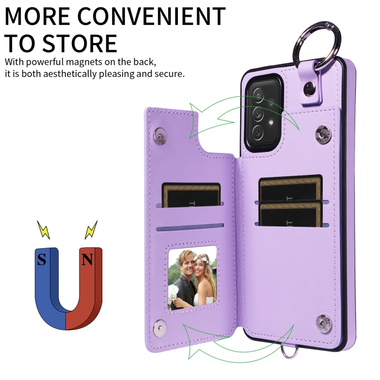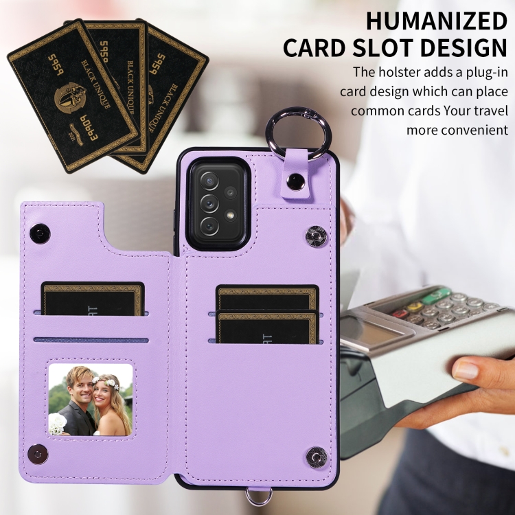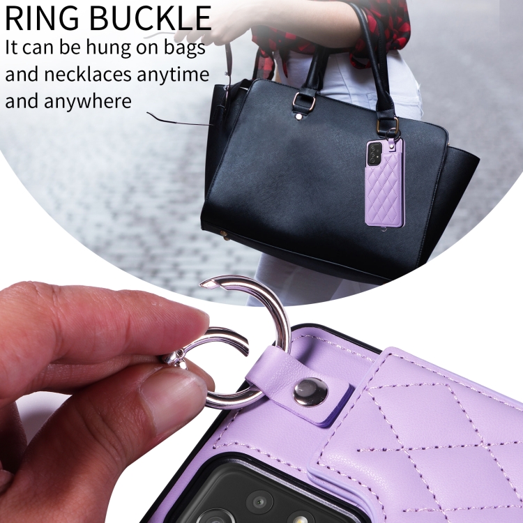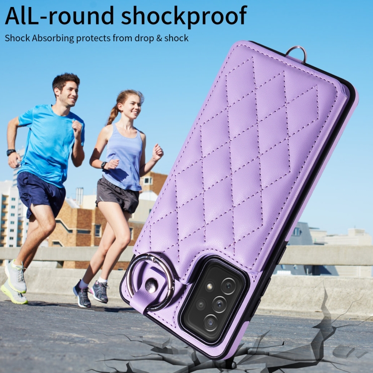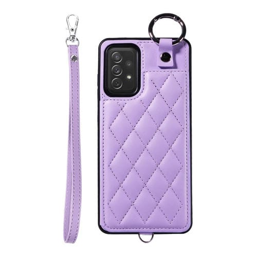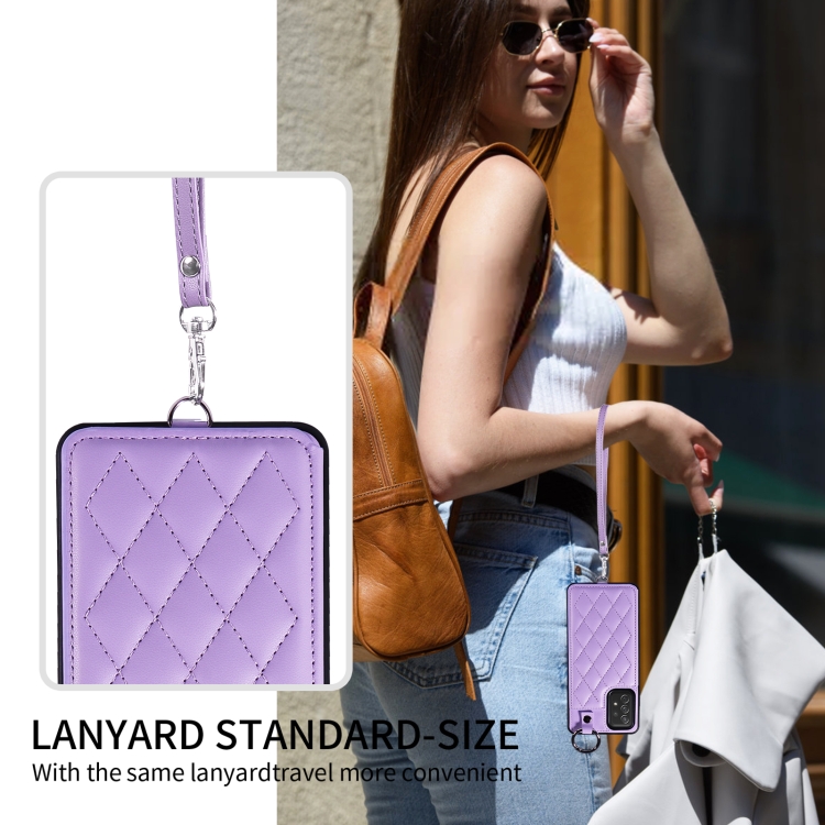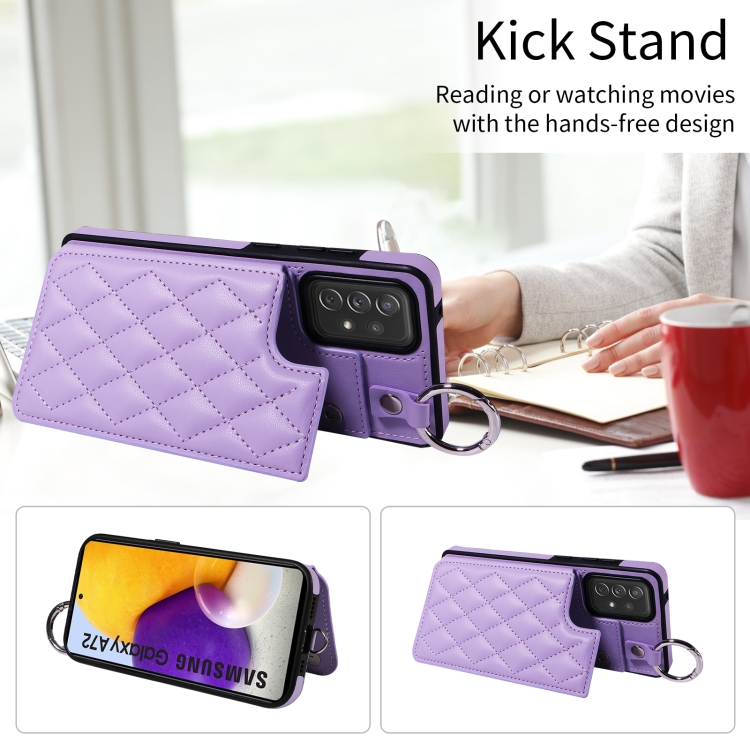 Estuche para teléfono Samsung Galaxy A72 4G 5G con bolsa para tarjetas textura rómbica y cordón corto (Púrpura)