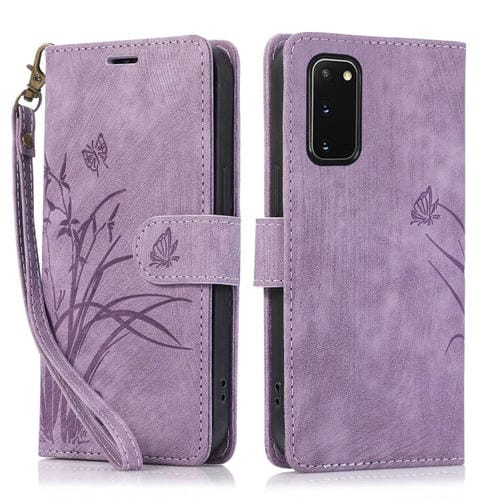 Funda de Cuero Samsung Galaxy S20 con Relieve de Mariposa Orquídea (Púrpura)