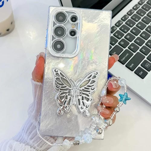 Estuche para Teléfono Samsung Galaxy S24 Ultra 5G con Pulsera Soporte Mariposa y Textura Película Lente Brillante (Papel de Aluminio Blanco)