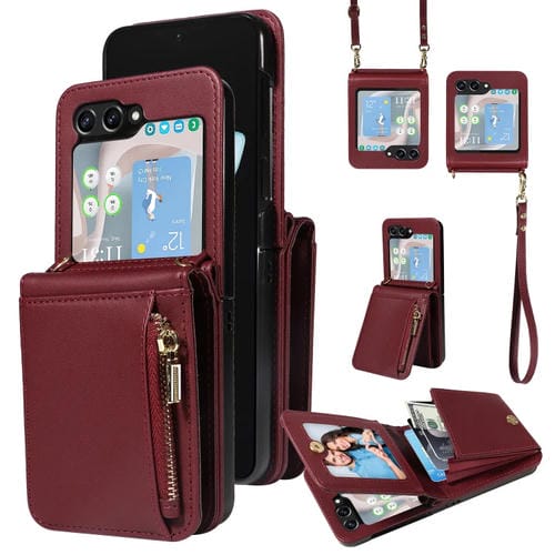 Funda para Samsung Galaxy Z Flip5 5G de Cuero con Billetera, Cremallera y Cordón Cruzado (Rojo Vino)
