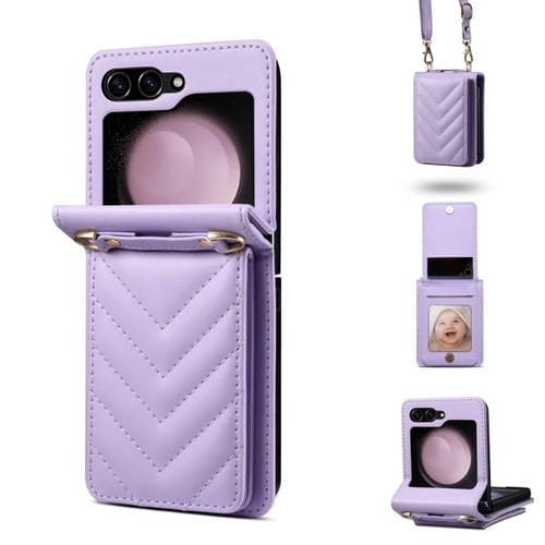 Estuche para Teléfono Samsung Galaxy Z Flip5 Cuero Plegable Rómbico con Cordón Largo (Púrpura)