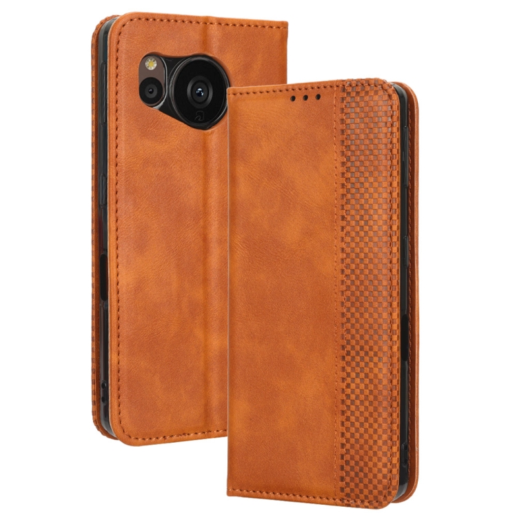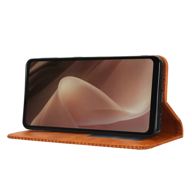Funda de Cuero para Sharp Aquos Sense7 con Hebilla Magnética y Textura Retro (Marrón)