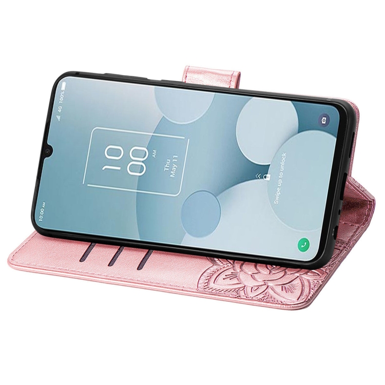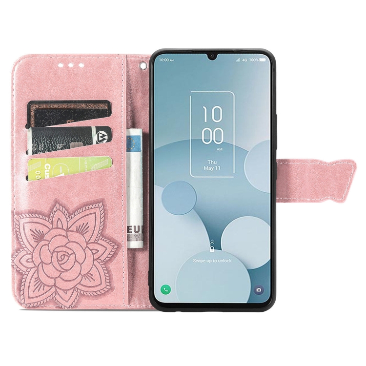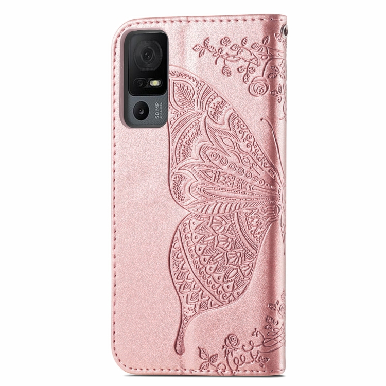 Funda para TCL 40 XL de Cuero con Relieve de Flor de Amor y Mariposa (Oro Rosa)