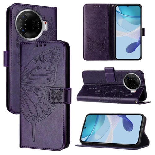 Funda de Cuero para Tecno Camon 30 Pro con Mariposa en Relieve (Púrpura Oscuro)
