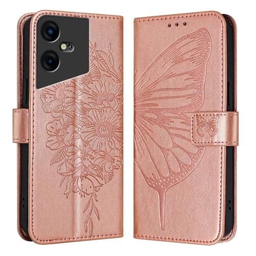 Funda de Cuero para Tecno Pova Neo 3 con Mariposa en Relieve (Oro Rosa)