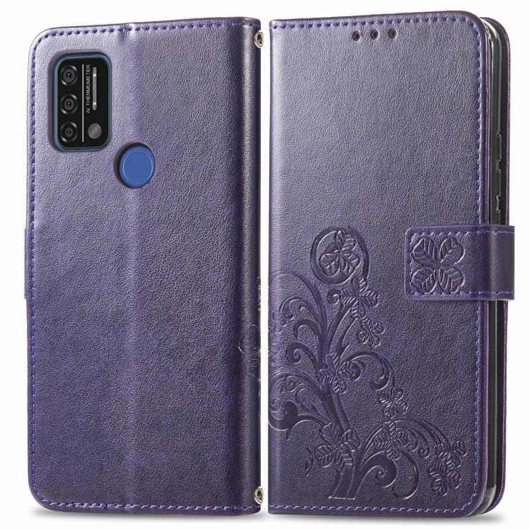 Funda de Cuero para Umidigi A9 con Cierre de Cuatro Hojas, Hebilla en Relieve, Ranura para Tarjeta y Soporte (Púrpura)
