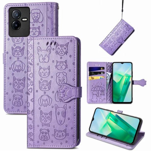 Para Vivo T2X Cute Cat And Dog Estuche de Cuero En Relieve para Teléfono (Púrpura)