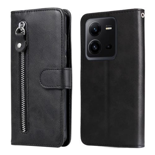 Para Vivo V25 5G/V25E 4G Funda de Cuero con Cremallera y Textura de Becerro para Teléfono (Negro)