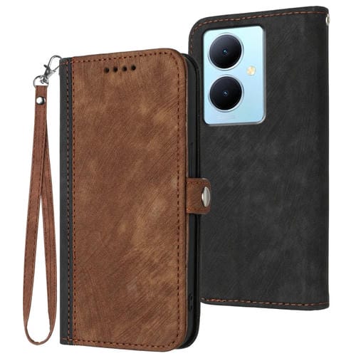 Para Vivo V29 Lite Funda para Teléfono de Cuero con Correa de Mano con Doble Pliegue y Hebilla Lateral (Marrón)