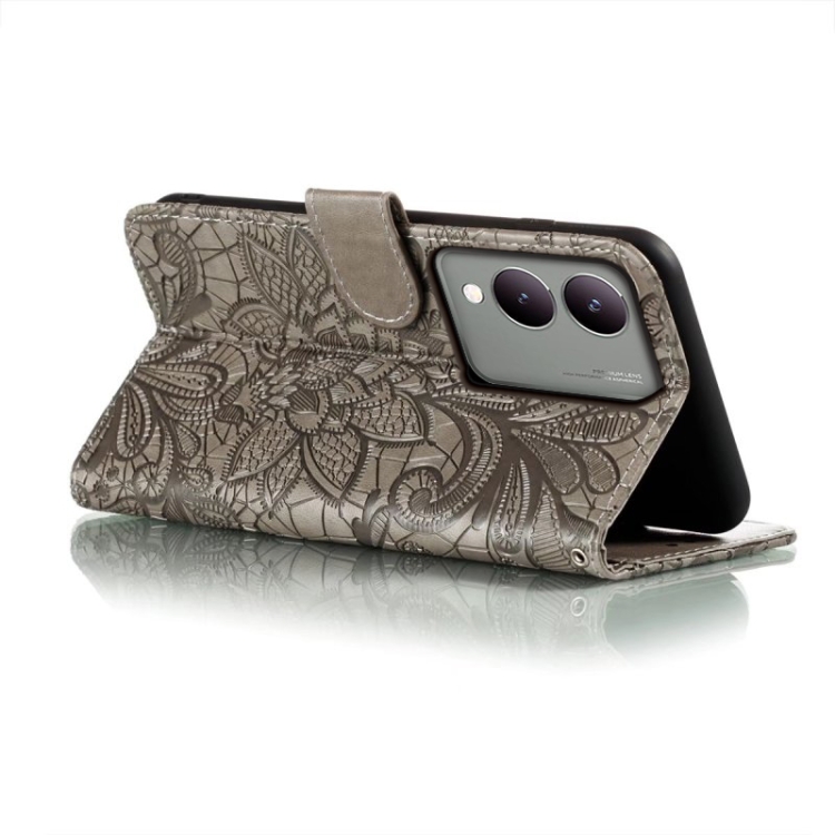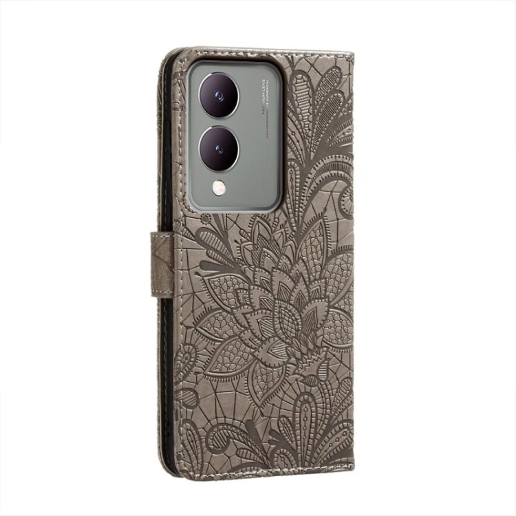 Para Vivo Y17S Funda para Teléfono de Cuero con Tapa y Estampado de Flores de Encaje (Gris)