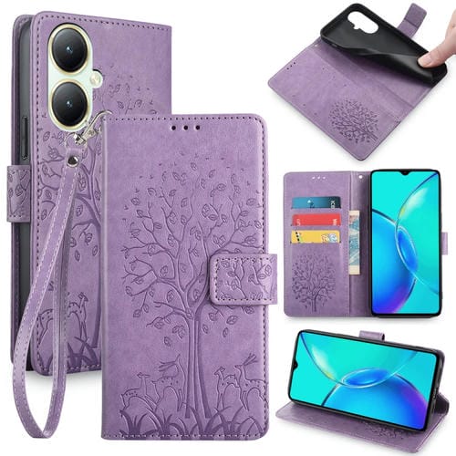Para Vivo Y35M + 5G / Y35 + 5G Funda para Teléfono de Cuero con Relieve de Árbol y Ciervo (Púrpura)