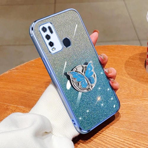 Para Vivo Y50 Funda para Teléfono de TPU con Soporte de Mariposa con Brillo Degradado Plateado (Azul Sierra)