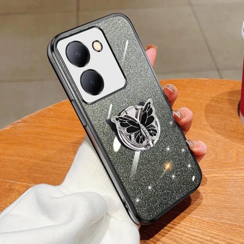 Para Vivo Y78 Funda para Teléfono de TPU con Soporte de Mariposa con Brillo Degradado Plateado (Negro)
