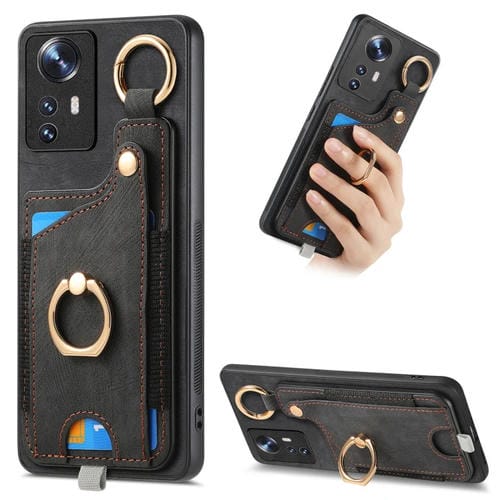 Para Xiaomi 12 Pro Funda para Teléfono con Bolsa para Tarjeta con Anillo y Sensación de Piel Retro con Lazo para Colgar (Negro)