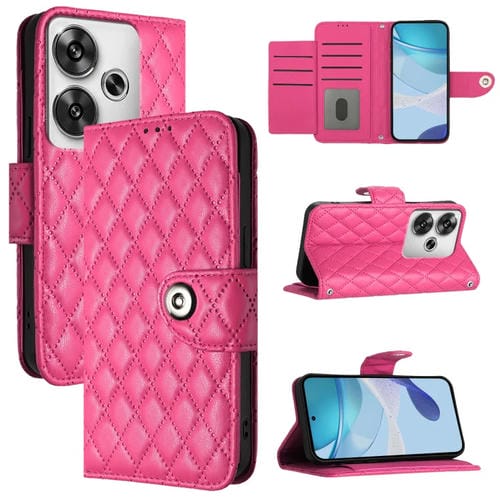 Para Xiaomi Poco F6 5G Funda para Teléfono con Tapa de Cuero con Textura Romboidal y Cordón (Rojo Rosa)