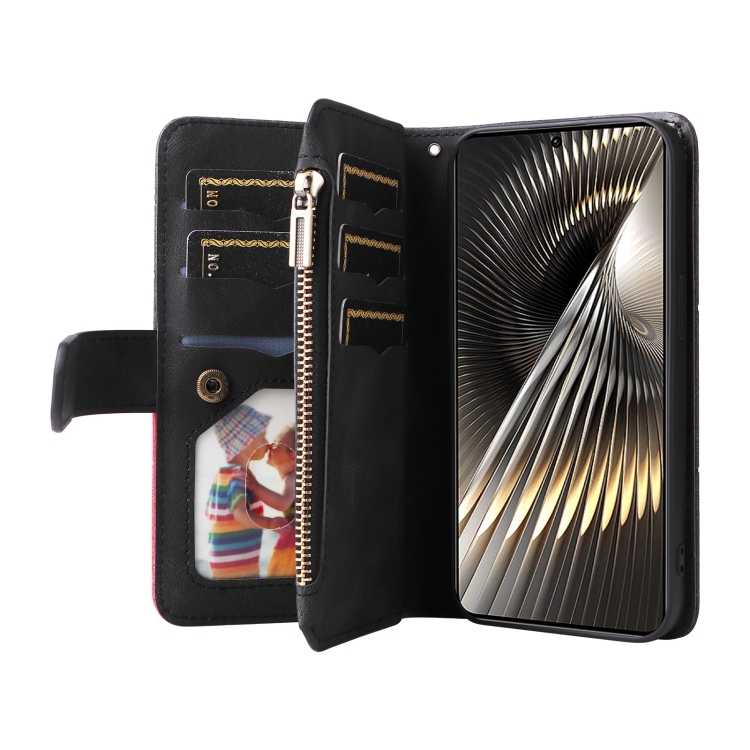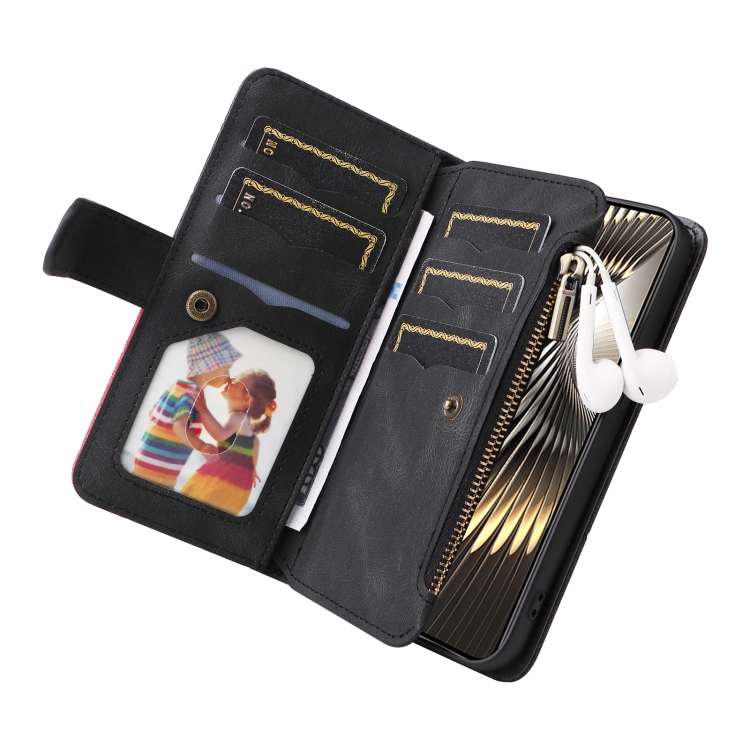 Para Xiaomi Poco F6 Funda de Cuero para Teléfono con Billetera con Cremallera y 9 Ranuras para Tarjetas de Doble Color (Negro)