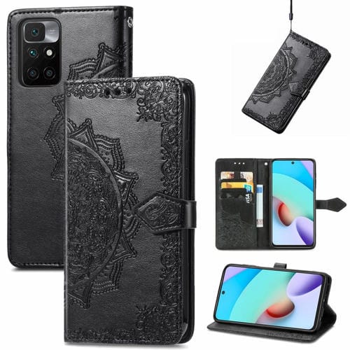 Para Xiaomi Redmi 10 Mandala Patrón de Estampado En Relieve Funda de Cuero con Soporte y Ranuras para Tarjetas y Billetera y Cordón (Negro)