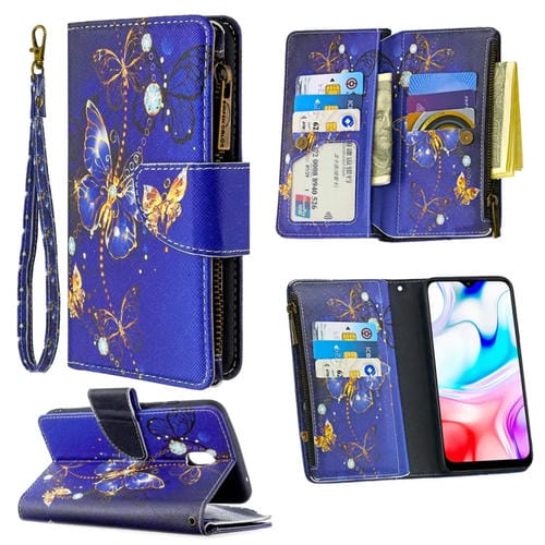 Para Xiaomi Redmi 8A Patrón de Dibujo de Colores Cremallera Funda de Cuero con Tapa Horizontal con Soporte y Ranuras para Tarjetas y Billetera (Mariposa Púrpura)