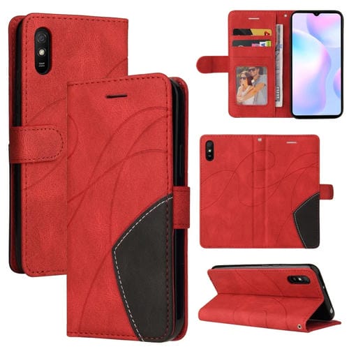 Para Xiaomi Redmi 9A Empalme de Doble Color Funda de Cuero Horizontal Flip Pu con Soporte y Tragamonedas y Billetera (Rojo)