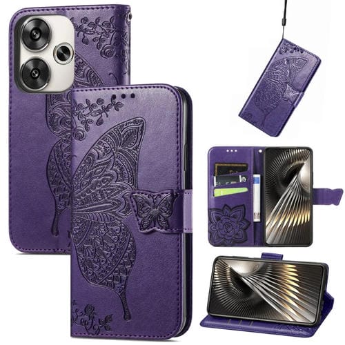Para Xiaomi Redmi Turbo 3 5G Butterfly Love Flower Funda de Cuero En Relieve para Teléfono (Púrpura)