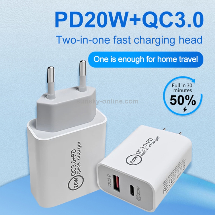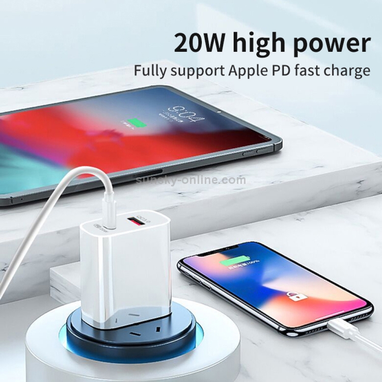 Cargador de viaje 20W Pd Tipo-C + Qc 3.0 con USB-C a 8 Pin carga rápida (Blanco)