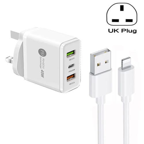 Cargador Usb Multipuerto 45W Pd25W + 2 X Qc3.0 con Cable Usb A 8 Pines (Blanco) para Reino Unido