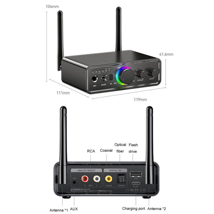 8. Tipo de interfaz: entrada: 3,5 mm AUX + RCA + óptica + coaxial + USB;Salida: 3,5 mm AUX + RCA