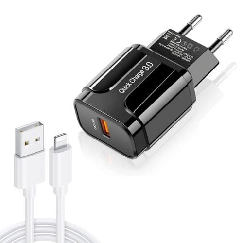 Cargador de viaje portátil Lz-023 18W QC 3.0 USB + cable datos 8 pines USB A (Negro)