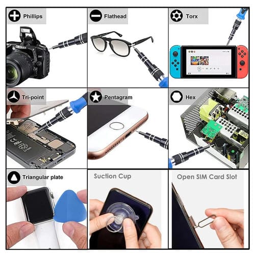 - Amplia variedad de puntas para adaptarse a múltiples tipos de tornillos en dispositivos electrónicos